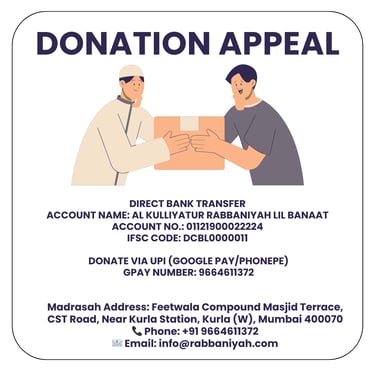 At Al Kulliyatur Rabbaniyah Lil Banaat, we are committed to providing authentic Islamic education for women of all ages. With the help of Allāh and your generous donations, we can continue to educate and empower Muslim women with the knowledge of the Qur’ān, Hadīth, Hifz, and Aalimiyyah studies. Your sadaqah and zakāh are not just financial contributions, they are a means to earn endless barakah and contribute to the preservation of sacred knowledge.